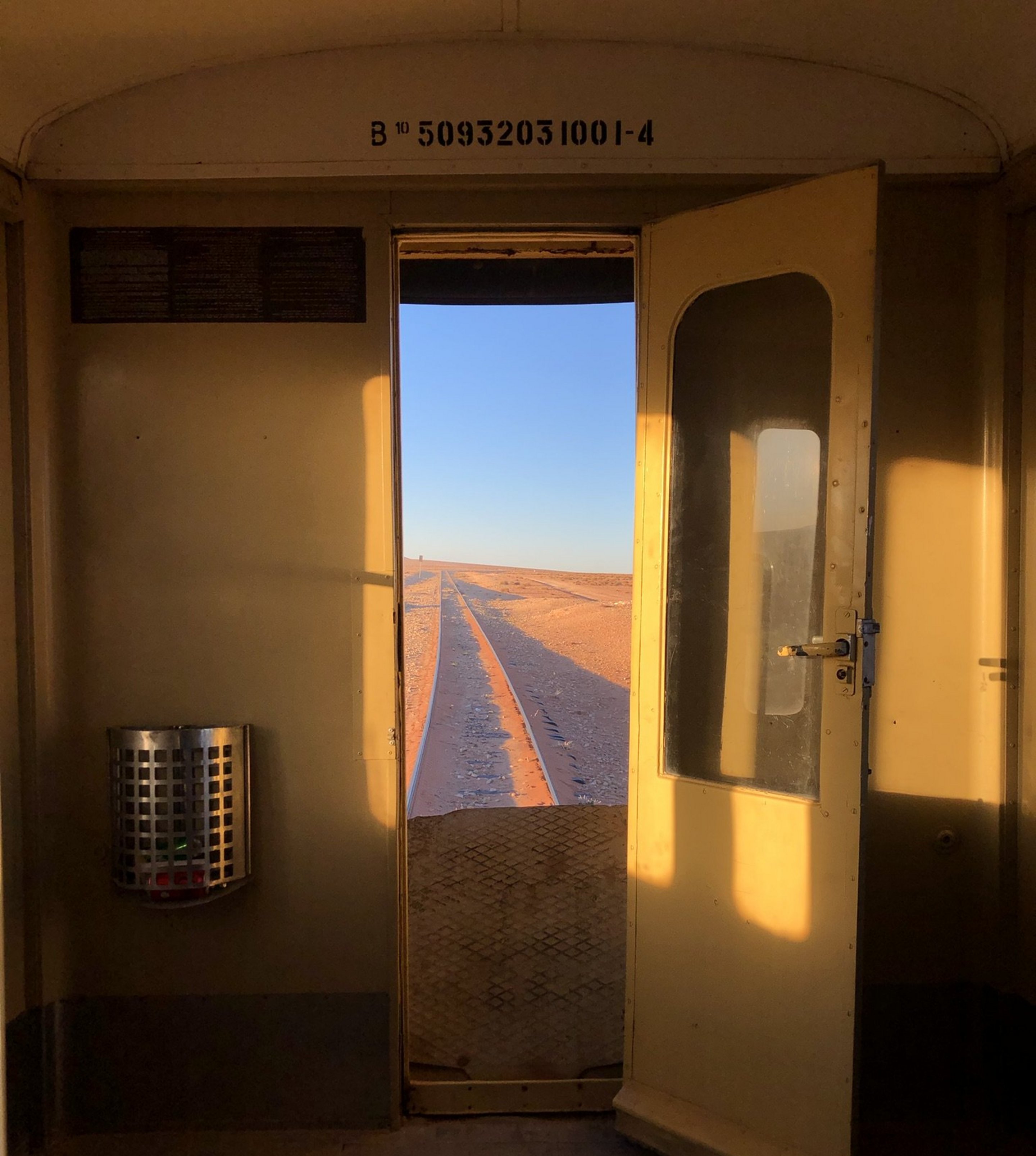 Zum nostalgischen Zug gehören eine Diesellokomotive, ein klimatisierter Erste-Klasse-Sitztplatzwagen, ein älterer Wagen mit Senkfenstern zum Öffnen und ein Küchenwagen. In der einfach ausgestatteten Küche mit Gaskochern zaubern die Köche ein wunderbares Menü aus Couscous, Tajine, Salat und Harira, der typischen vegetarischen Gemüsesuppe.