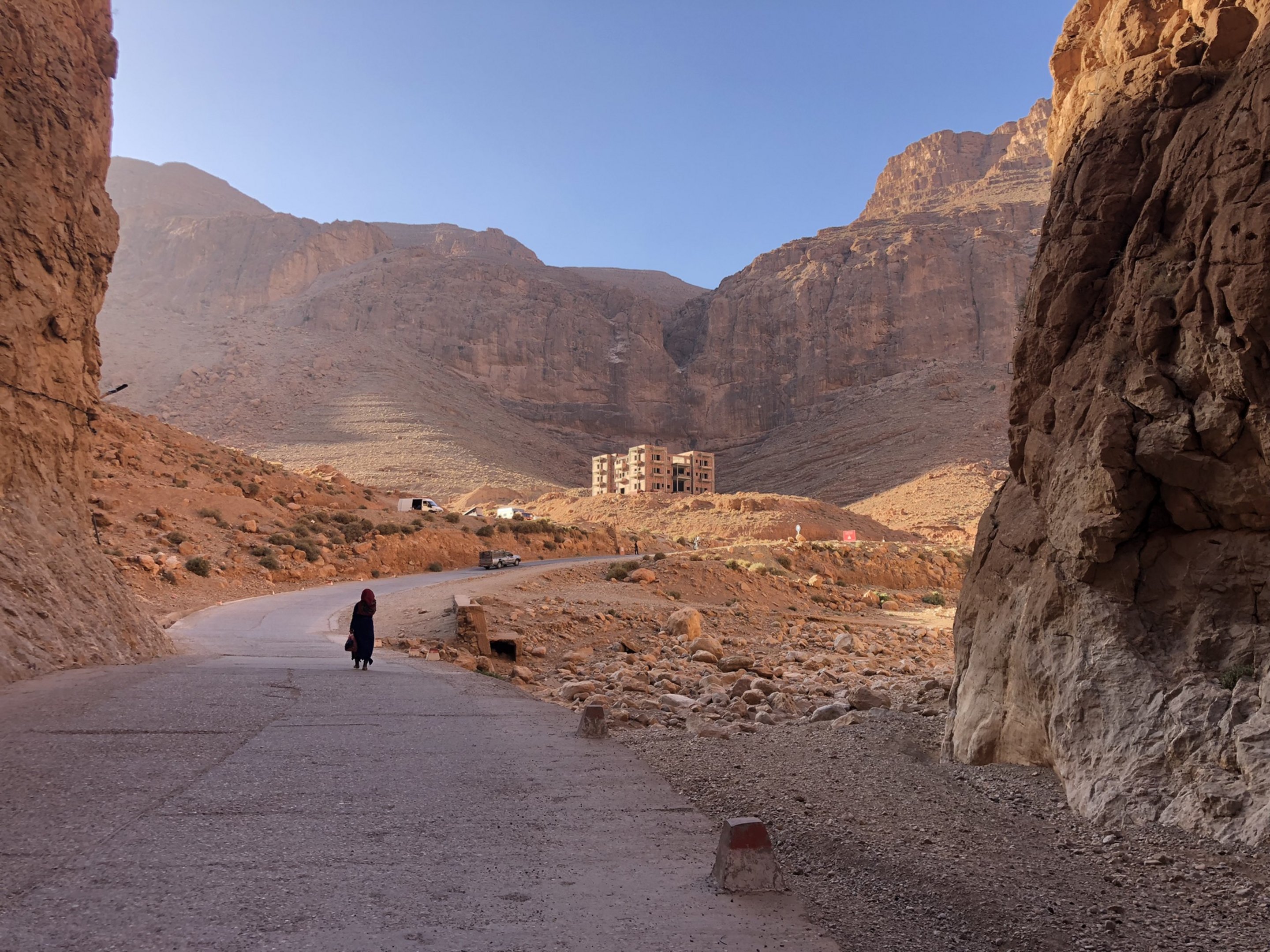 Auf dem Weg in die Oasenstadt Tinghir halten wir in Tinjdad an. In einem alten Ksar, einer Berbersiedlung, besuchen wir das El Khorbat-Museum und erfahren spannende Einzelheiten über die Bewohner*innen in Südmarokko. Angekommen in Tinghir spazieren wir durch die eindrückliche Todgha-Schlucht und später durch die Innenstadt.