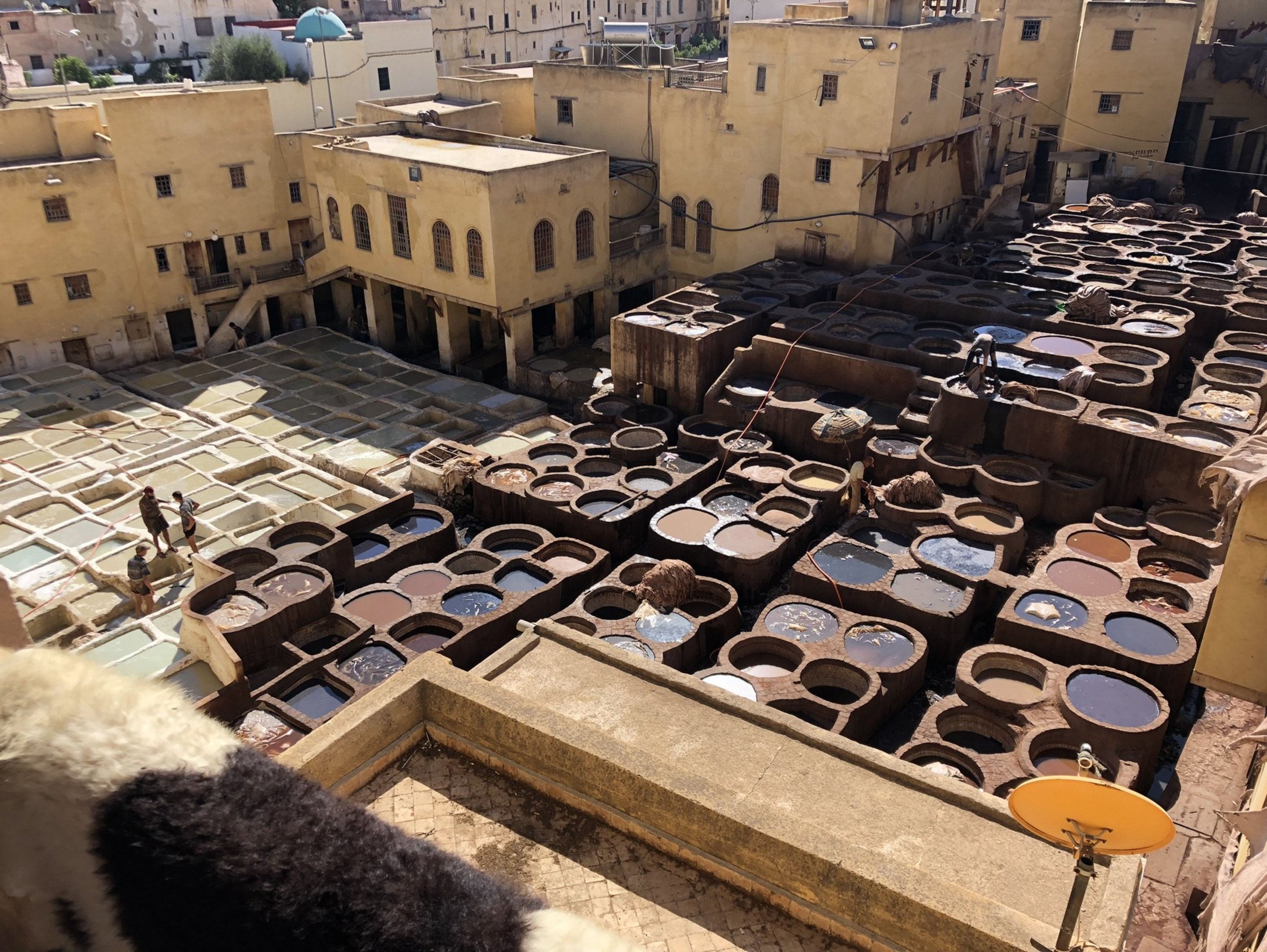 In der Altstadt, der «Medina», staunen wir über die engen Gassen und das emsige Treiben der Händler. Um die Privatsphäre zu gewähren, sind die gegenüberliegenden Türen immer versetzt voneinander angelegt. Weiter darf ein Besuch der berühmten Gerberei nicht fehlen. Wir sind froh, dass wir uns einen Büschel frische Minze an die Nase halten können – hier riecht es ziemlich streng.