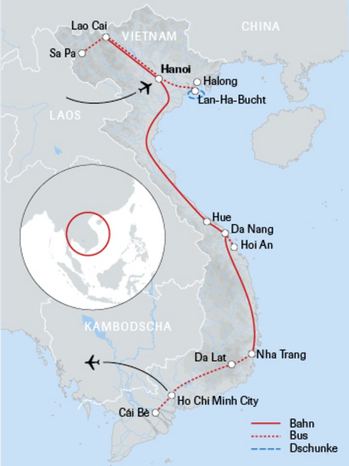 Vietnam bietet weit mehr als schöne Strände. Von den mystisch, kühlen Berglandschaften und den Reisterrassen im Norden bis zum Naturparadies des Mekong-Deltas im Süden, führt die Reise durch das ganze Land mit spannenden Aufenthalten in den schönsten Orten unterwegs. Das Erlebnis einer Nacht auf einem Schiff in der malerischen Lan-Ha-Bucht darf dabei ebenso nicht fehlen, wie die Fahrt mit der Stand- und Luftseilbahn auf den höchsten Berg Indochinas. Auf dem Wolkenpass überqueren Sie die Wetterscheide zwischen Nord- und Südvietnam und im Ferienort Dalat ist noch heute ein Hauch von «Grande Nation» zu spüren aus den alten Kolonialzeiten.