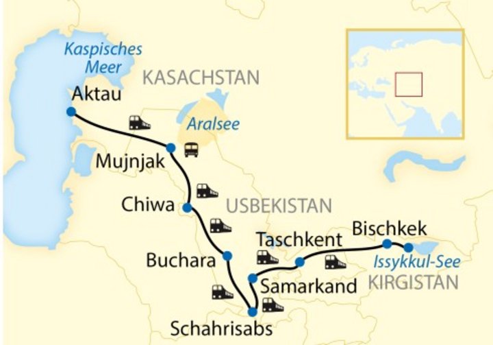 - Im exklusiv gecharterten Sonderzug reisen Sie mit dem grösstmöglichen Komfort auf der Seidenstrasse in Zentralasien