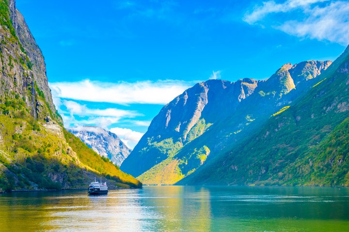 Mit Bahn und Bus erreichen Sie Voss und Gudvangen am Nærøyfjord, dem engsten Fjord des Landes. Per Schiff durchqueren Sie den Meeresarm bis Flåm. Mit der Flåmsbahn gelangen Sie auf der beeindruckenden Steigungsstrecke hinauf nach Myrdal, von wo es mit dem Zug weiter nach Bergen geht.