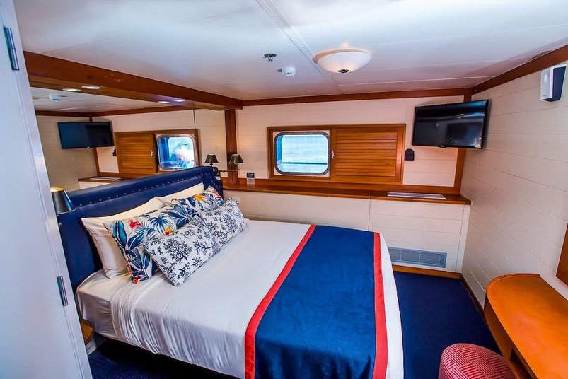 Doppelkabine mit entweder einem Doppelbett oder zwei Einzelbetten, Fenster und Dusche/WC. Die Kabinen sind 11 m2 gross und liegen auf dem Frangipani Deck.