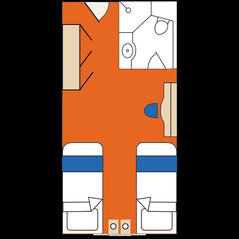 Doppelkabinen mit Stockwerkbetten, Schminktisch, Fenster oder Bullaugen sowie Dusche/WC. Die Kabinen sind 10 qm2 gross und befinden sich auf dem A-Deck sowie dem B-Deck.