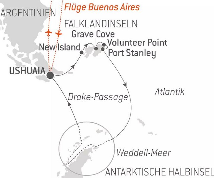 Ausschiffung in Ushuaia und Transfer zum Flughafen für den Flug nach Buenos Aires. Anschliessend individuelle Heim- oder Weiterreise.