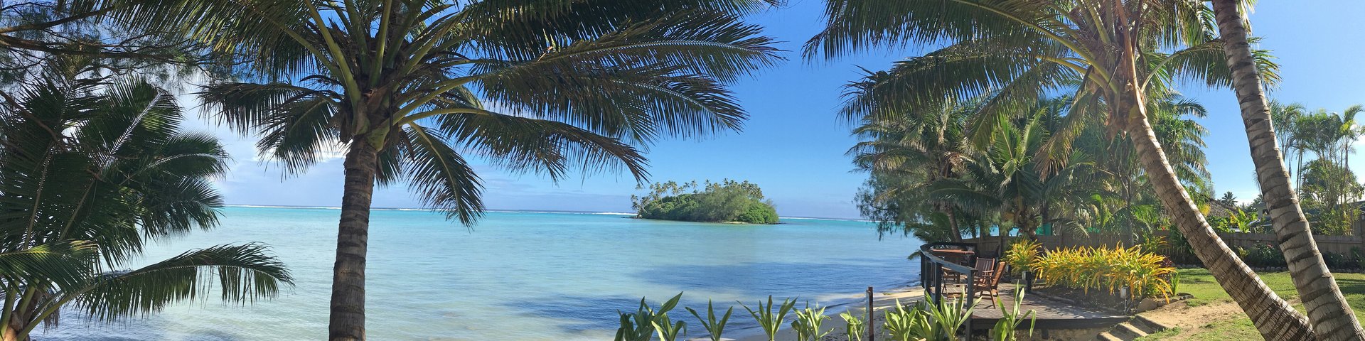 Panoramic landscape view of Muri lagoon as view from a beautiful tropical beach in Rarotonga Island, Cook Islands.